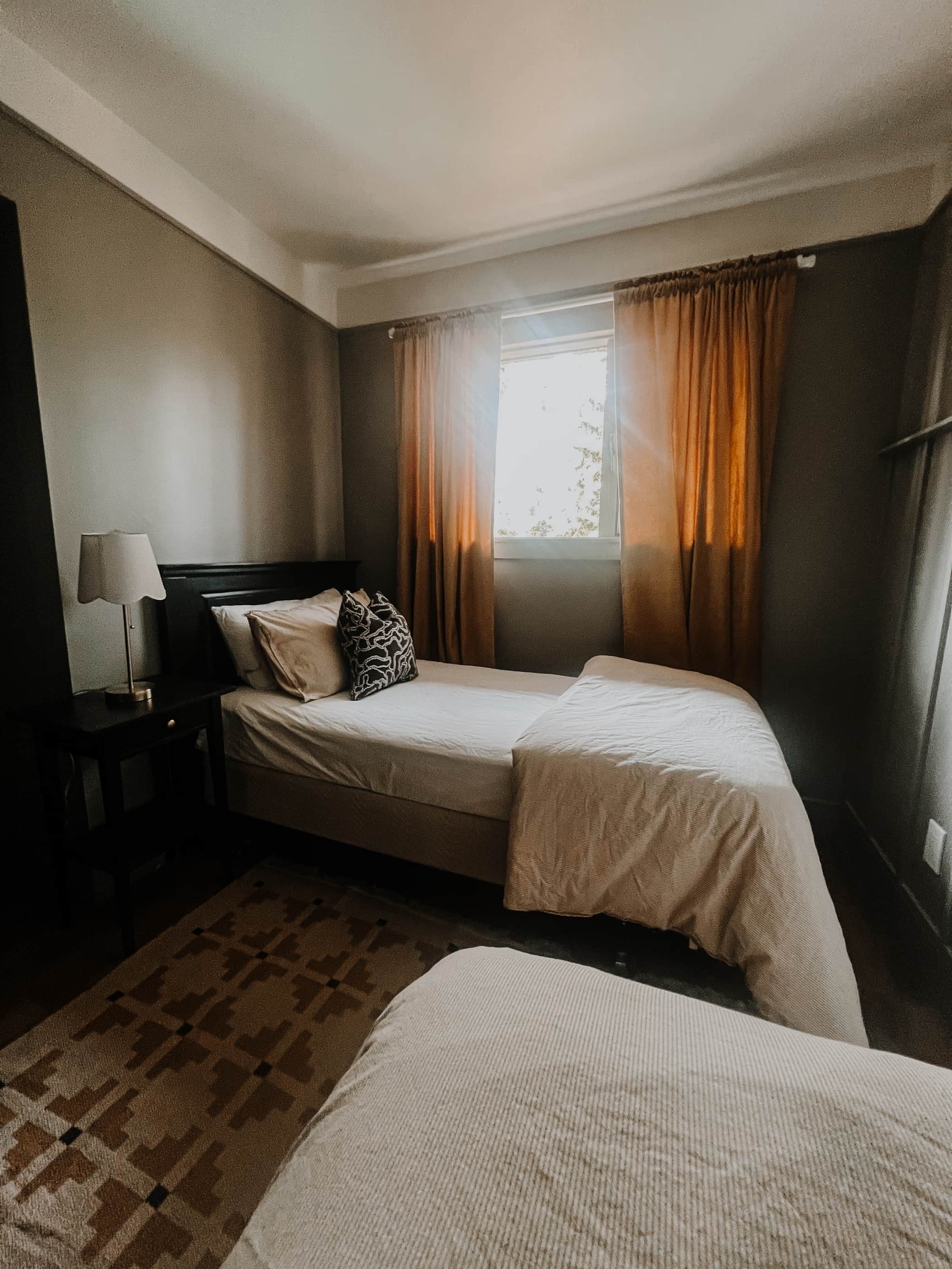 Sophisticated twin room with earthy tones and plenty of natural light.